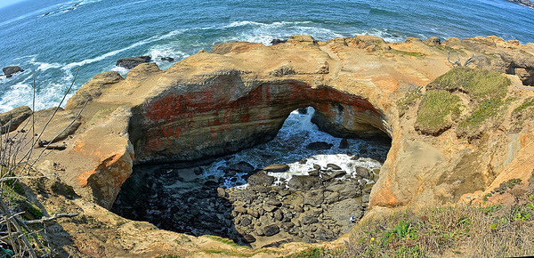 Devils Punch Bowl State Natural Area is a state day use park on the central Oregon Coast in the United States. It is centered on a large bowl naturally carved in a rock headland which is partially open to the Pacific Ocean. Waves enter the bowl and often violently churn, swirl, and foam. Outside the bowl, ocean conditions are attractive to surfers near a large offshore rock pinnacle named Gull Rock, located about 1⁄2 mile (800 m) west-northwest of Devils Punch Bowl, which funnels and concentrates waves easily seen from the park. There are at least seventeen large rocks, part of Oregon Islands National Wildlife Refuge, which provide interesting wave viewing, and attract and provide a home for wildlife. Devils Punch Bowl is located about 5 miles (8.0 km) south of Depoe Bay, and about 8 miles…