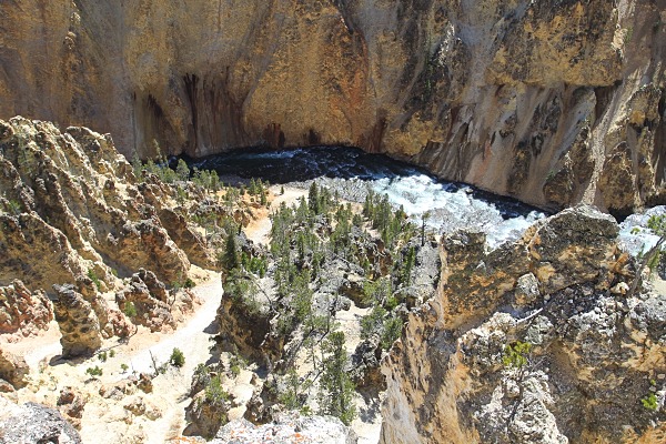 from the North Rim. A very short paved path leads to an observation point providing views of the falls and the colorful rhyolite walls lining the