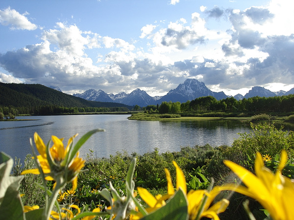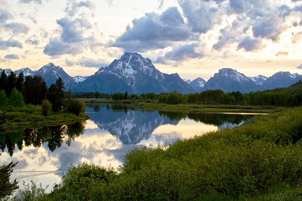 The Oxbow Bend is a very famous place to photograph the Tetons. During the Fall, the aspens and cottonwoods across the Oxbow Bend turn bright yellow and orange providing bright contrast with the blue Mount Moran towering in the distance.