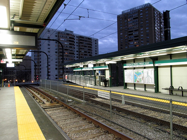 Science Park (signed as Science Park/West End) is an elevated light rail station on the MBTA Green Line, and is located at the Boston end of the Old Charles River Dam at Leverett Circle, near the intersection of Nashua Street and Charles Street (Storrow Drive). The station is located on the Lechmere Viaduct, which connects North Station to the Lechmere terminus of the Green Line. As of 2015, the station is served only by the Green Line "E" Branch, which runs from Heath Street to Lechmere. The station is located at an area of land called Science Park, which it is named after. It is near the Boston Museum of Science. Science Park is one of a small number of elevated rapid transit stations remaining in the MBTA system. (The only others are Beachmont on the Blue line; Malden Center on the…