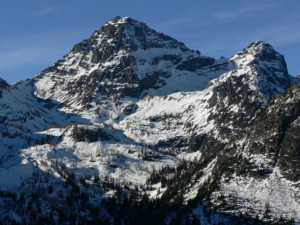 Black Peak is a tall peak in the Cascade Range in the U.S. state of Washington. It lies in the Stephen Mather Wilderness and North Cascades National Park. At 8,975 feet (2,736 m) in elevation it is the 20th-highest peak in Washington. Black Peaks's prominence is 3,450 feet (1,050 m), making it the 35th-most prominent peak in Washington. The nearest higher peak is Goode Mountain, 5.2 miles (8.4 km) to the west-southwest. Black Peak is a non-volcanic mountain and is popular among hikers and campers worldwide.