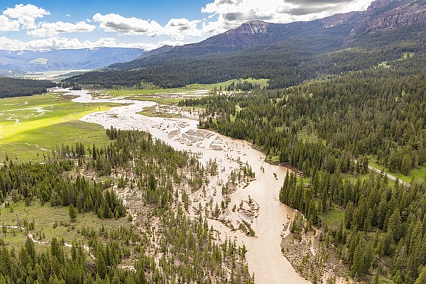 Pictured above is the confluence of Soda Butte Creek and Pebble Creek at high water on June 13, 2022. From June 10th to June 13th, heavy rain and melting snowcaps caused massive flooding in the north area of the park. Jacob W. Frank’s (NPS) photograph above shows a sun lit Round Paraire to the left of Soda Butte Creek, with the Stonehenge-like volcanic rock cliffs of Druid Peak’s east face overlooking the Pebble Creek confluence.