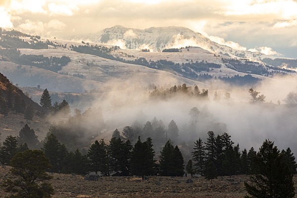 Foggy views of Druid Peak (photo center) near Tower Junction, Jacob W. Frank (NPS) photograph above.