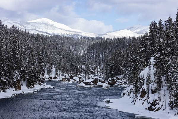 Yellowstone River in winter, with Dunraven Peak on left and Mt. Washburn on right, Jacob W. Frank (NPS) photograph above.