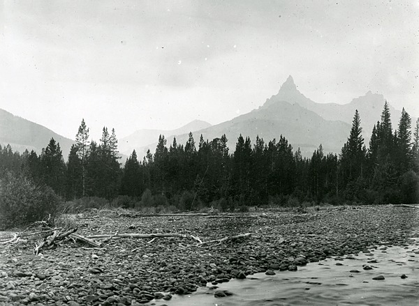 Index Peak, showing erosion in bedded breccia and basalt sheets. Yellowstone National Park, Wyoming. ca. 1890. Photo 379 Joseph Paxson Iddings (USGS) Photo nos. 378-379 form a panorama published as Plate 28 in U.S. Geological Survey. Monograph 32, pt. 2. 1899. [Pilot Peak (left) and Index Peak (right) pictured below:]