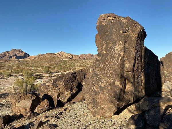 Two distinct styles of petroglyphs, Western Archaic and Gila are identifiable in the Indian Spring Area. The Western Archaic Style is identified by rectilinear designs such as grids, ladders, zig zags, beehives and bull’s eyes. These are the most prevalent in the area, indicating long and intense use by Archaic peoples from about 1500 B.C. to A.D. 1. The Gila Style, common to the Hohokam peoples after A.D. 500, includes abstract curvilinear designs, and human and animal forms. The lithic scatters, stone mortars, and hunting blinds found in this area indicate that the Eagletail Mountains also provided an abundance of resources that were relatively scarce in the desert. Please avoid touching any of these items as it could hasten their deterioration.