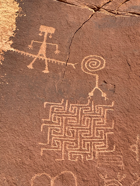 The Maze Rock Art Site got its name from the abstract, maze-like petroglyph featured prominently on the main panel. This rock art is thought to have originated between A.D. 850 and 1300. Art from this time period often depicts human-like images and animal forms, such as bighorn sheep, deer, and mountain lion. Geometric patterns are also common, including mazes, spirals, and concentric circles. Studying the images at this site can help tell the story of what life was like for prehistoric people.