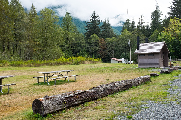 . There are a few picnic tables in a grassy area and a restroom at the site.