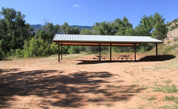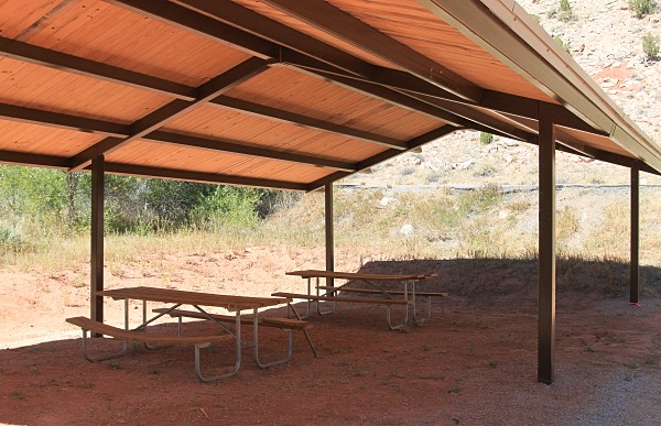 Trail Creek Picnic Area consists of several picnic tables underneath a metal shelter at