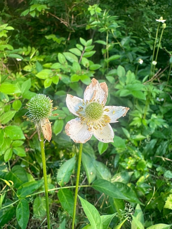 Anemone virginiana is an upright growing herbaceous species of flowering plant buttercup family Ranunculaceae. It is a perennial that grows 30–80 centimetres (12–31 in) tall, flowering from May until July, the flowers are white or greenish-white. After flowering the fruits are produced in a dense rounded thimble shaped spikes 15–35 millimetres (0.59–1.38 in) long and 12 millimetres (0.47 in) wide. When the fruits, called achenes, are ripe they have gray-white colored, densely woolly styles, that allow them to blow away in the wind. The leaf structure is whorled halfway up the stem and each individual leaf appears to be deeply cut. Native from eastern North America, where it is found growing in dry or open woods. This plant can be found in 38 out of the 50 states in the U.S. and is located…