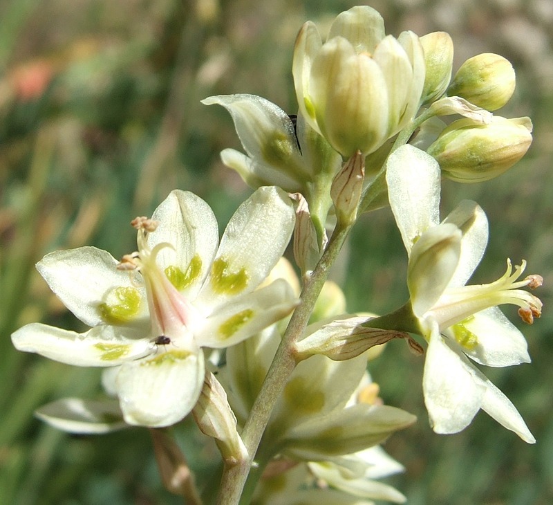 Anticlea elegans, formerly Zigadenus elegans, is also known as mountain deathcamas, elegant camas or alkali grass. It is not a grass (though its leaves are grass-like), but belongs to the trillium family, Melanthiaceae. It has white lily-like flowers and two-pronged, greenish-yellow glands on each petal (the shape of which can help in distinguishing it from other members of the genus). It is widely distributed throughout North America and occurs in many habitats. Plants on the western side of the continent tend to be smaller in size than their eastern counterparts, but have more densely clustered flowers. The plant is extremely poisonous.Meriwether Lewis, while on the course of his expedition in 1806, collected a specimen near the Blackfoot River.