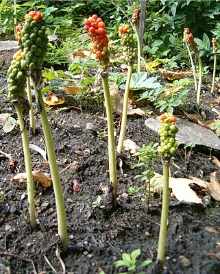 Arum is a genus of flowering plants in the family Araceae, native to Europe, northern Africa, and western and central Asia, with the highest species diversity in the Mediterranean region. Frequently called arum lilies, they are not closely related to the true lilies Lilium. Plants in closely related Zantedeschia are also called "arum lilies". They are rhizomatous, herbaceous perennial plants growing to 20–60 cm tall, with sagittate (arrowhead-shaped) leaves 10–55 cm long. The flowers are produced in a spadix, surrounded by a 10–40 cm long, distinctively coloured spathe, which may be white, yellow, brown, or purple. Some species are scented, others not. The fruit is a cluster of bright orange or red berries. All parts of the plants, including the berries, are poisonous, containing calcium…