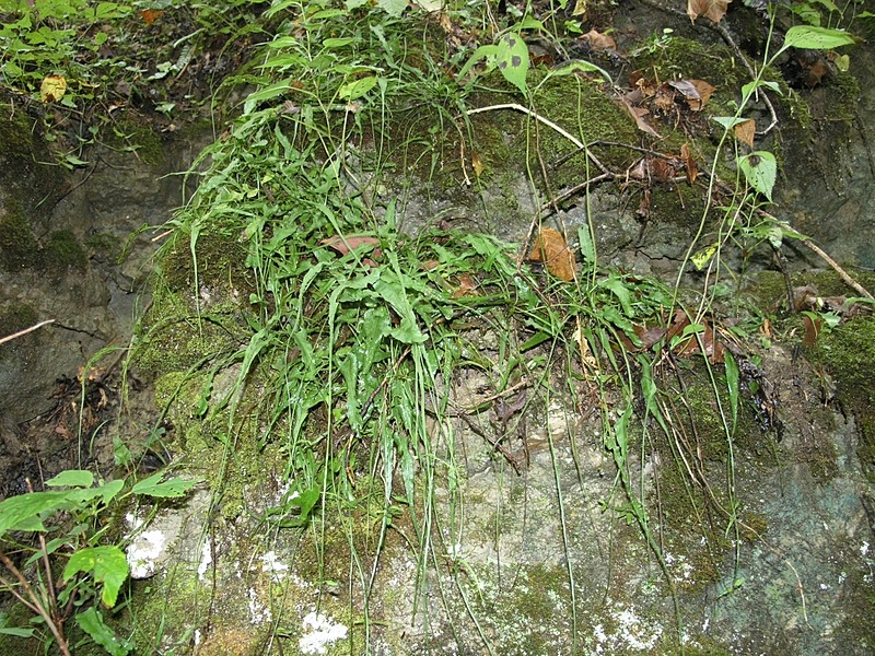 Asplenium rhizophyllum, the (American) walking fern, is a frequently-occurring fern native to North America. It is a close relative of Asplenium ruprechtii (syn: Camptosorus sibiricus) which is found in East Asia and also goes by the common name of "walking fern".