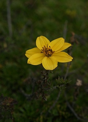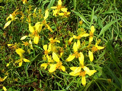 Bidens is a genus of flowering plants in the aster family, Asteraceae. The common names beggarticks, black jack, burr marigolds, cobbler's pegs, Spanish needles, stickseeds, tickseeds and tickseed sunflowers refer to the fruits of the plants, most of which are bristly and barbed, with two sharp pappi at the end. The generic name refers to the same character; Bidens comes from the Latin bis ("two") and dens ("tooth").