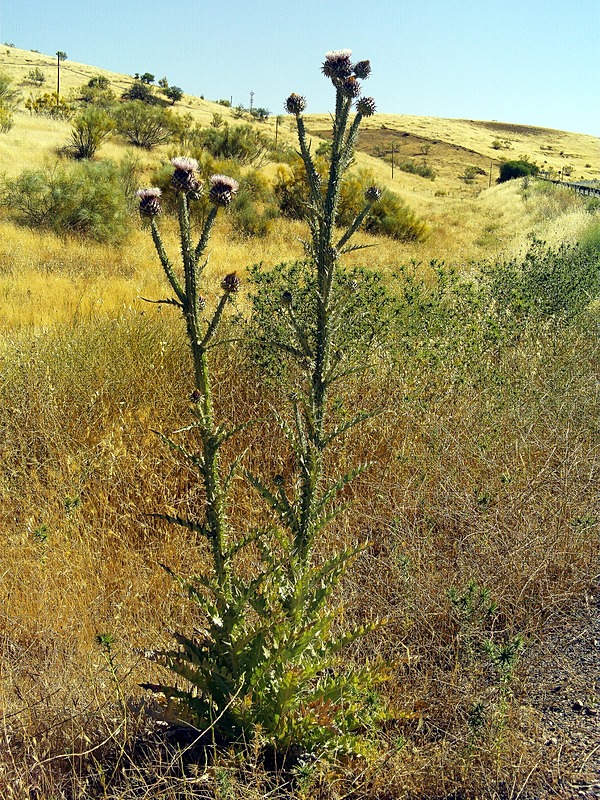 Onopordum illyricum is a species of thistle known by the common name Illyrian thistle, or Illyrian cottonthistle. It is native to southwestern Europe, but has been introduced into Australia and California, where it has become a noxious weed. The plant is a biennial herb producing an erect, branching, winged, spiny stem known to exceed two meters in maximum height. The spiny leaves may be up to 50 centimetres (20 in) long and are divided into deep toothed lobes. The inflorescence bears several large flower heads each up to 7 centimetres (3 in) wide. They are lined with spiny, woolly to cobwebby phyllaries and bear many narrow glandular purple flowers each about 3 centimetres (1.2 in) long. The fruit is a cylindrical achene 4 or 5 millimetres (0.16 or 0.20 in) long topped with a white…