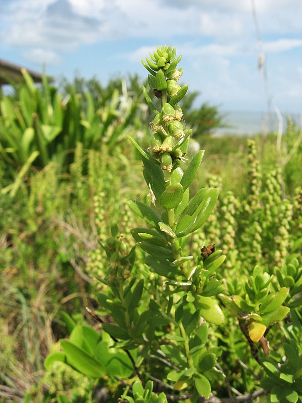 Iva imbricata is a North American species of flowering plant in the aster family known by the common names dune marsh-elder and seacoast marsh elder. It is native to Cuba, the Bahamas, and coastal areas of the United States from Texas to Virginia. It is a low shrub, found on sand dunes and the upper beach. It is a highly salt tolerant plant, and is often the perennial plant closest to the ocean. Iva imbricata is an important species for dune stabilization and can easily be propagated by cuttings. It sometimes grows up to 100 cm (40 inches) tall. It produces numerous flower heads in elongated arrays, each head with 2-17 disc flowers but no ray flowers.