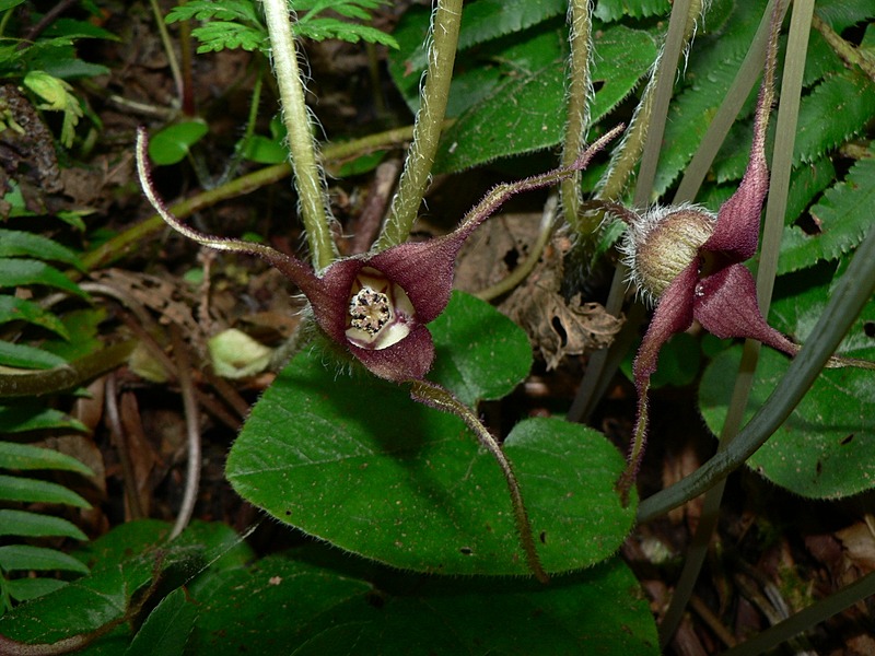 Asarum caudatum (British Columbia wild ginger, western wild ginger, or long-tailed wild ginger) is native to rich moist forests of western North America from British Columbia to California and as far east as western Montana. It is an evergreen with flowers that develop from March to August. The flowers are distinct, hirsute (hairy), cup-shaped, and brown-purple to green-yellow which terminate in three, long, gracefully curved lobes, often concealed by leaves. The long rhizomes give rise to persistent reniform (kidney/heart shaped) leaves. Leaves are found in colonies or clusters as the rhizome spreads, forming mats. The leaves emit a ginger aroma when rubbed.