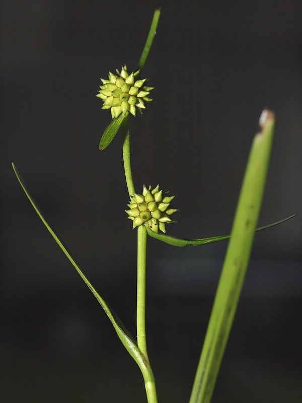Sparganium natans is a species of bur-reed known by the common names least bur-reed and small bur-reed. It is a water circumboreal plant inhabiting North America, Europe, West Asia and Japan. It is usually found submersed in shallow, calm water. This bur-reed has thin, flexible, grasslike leaves which float in the water. Plants that spend more time out of water at the waterline are tougher and have shorter leaves. The plant bears two inflorescences, the staminate type being a rounded white filamentous ball and the pistillate type a sphere of thick, green, pointy peduncles. The fruits are small green or brown achenes.