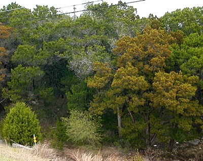 Juniperus ashei (Ashe juniper, Mountain Cedar, Blueberry Juniper, Post Cedar, or just Cedar) is a drought-tolerant evergreen tree, native from northeastern Mexico and the south-central United States to southern Missouri. The largest areas are in central Texas, where extensive stands occur. Ashe juniper grows up to 10 m (33 ft) tall, and over time can reach 15 m (49 ft), and provides erosion control and year-round shade for wildlife and livestock. The feathery foliage grows in dense sprays, bright green in color. The leaves are scale-like, 2 to 5 mm (0.079 to 0.197 in) long, and produced on rounded (not flattened) shoots. It is a dioecious species, with separate male and female plants. The seed cones are round, 3 to 5 mm (0.12 to 0.20 in) long, and soft, pulpy and berry-like, green at…
