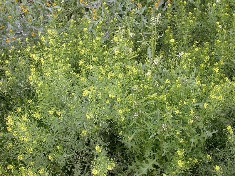 Descurainia pinnata is a species of flowering plant in the family Brassicaceae known by the common name western tansymustard. It is native to North America, where it is widespread and found in varied habitats. It is especially successful in deserts. It is a hardy plant which easily becomes weedy, and can spring up in disturbed, barren sites with bad soil. This is a hairy, heavily branched, mustardlike annual which is quite variable in appearance. There are several subspecies which vary from each other and individuals within a subspecies may look different depending on the climate they endure. This may be a clumping thicket or a tall, erect mustard. It generally does not exceed 70 centimeters in height. It has highly lobed or divided leaves with pointed, toothed lobes or leaflets. At the…