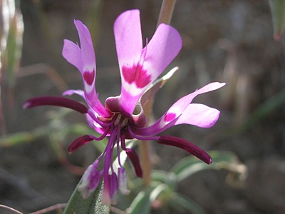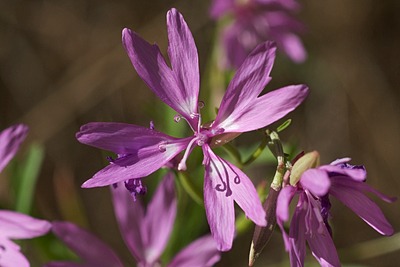 Clarkia is a genus within the flowering plant family Onagraceae. Over 40 species are currently classified in Clarkia; almost all are native to western North America, though one species (Clarkia tenella) is native to South America. Clarkias are typically annual herbs, growing either prostrate or erect to a height of less than 2 metres. Their leaves are small and simple, from 1 to 10 cm in length depending on the species. Their flowers have four sepals and four petals, usually white, pink, or red, and are often spotted or streaked. Their fruit are elongated, cylindrical pods, usually 4-grooved or 8-grooved, and when mature they hold many tiny, cubical seeds.Several members of the genus are sometimes referred to by the common name "godetia", including Clarkia amoena, Clarkia affinis, and…