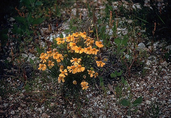 Helenium amarum is a species of annual herb in the daisy family known by the common names yellowdicks, yellow sneezeweed, fiveleaf sneezeweed, and bitter sneezeweed. It is native to much of the south-central United States (Texas, Oklahoma, Louisiana, Arkansas, New Mexico) and northern Mexico (Chihuahua, Coahuila), and it is present elsewhere in North America, Australia, and the West Indies as an introduced species.Helenium amarum is a multibranched bushy erect plant reaching 20 to 70 centimeters (8-28 inches) in height and thickly foliated in narrow to threadlike leaves. The tops of stem branches hold inflorescences of many daisy-like flower heads. Each head has a rounded center of sometimes as many as 250 golden yellow disc florets and a fringe of 8-10 usually lighter yellow ray florets…