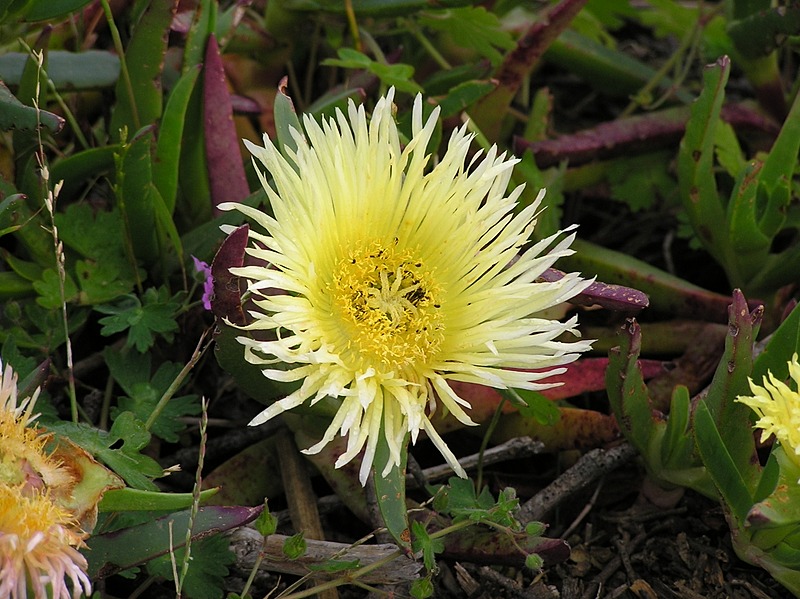 Carpobrotus edulis is a ground-creeping plant with succulent leaves in the genus Carpobrotus, native to South Africa. It is also known as Hottentot-fig (though this nickname is considered a racist term), ice plant, highway ice plant, or pigface, and in South Africa as the sour fig (suurvy). It was previously classified in Mesembryanthemum and is sometimes referred to by this name: Mesembryanthemum edule.