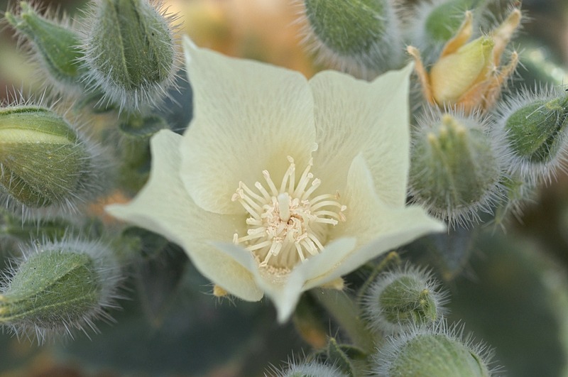 Eucnide urens, also known as desert rock nettle or desert stingbush, is a shrub which is native to desert areas in California, Arizona, Utah and Baja California. Other common names are velcro plant and vegetable velcro.The flowers, which appear from spring to early summer, are cream or pale yellow with 5 petals and are 2.5 to 5 cm long. The coarsely serrated leaves are 2 to 6.5 cm long with stinging hairs which are also found on the stems and buds. The plant is round and bushy and is usually between 30 and 60 cm in height and is often found on cliff faces. Desert bighorn sheep feed on the flowers.
