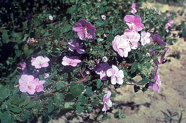 Pavonia lasiopetala is a species of flowering plant in the mallow family known by the common names that include Texas swamp-mallow, Wright pavonia, and rock rose. It is native to Texas in the United States and Coahuila and Nuevo León in Mexico.This is a shrubby perennial herb growing up to 4 feet tall. The alternately arranged leaves have toothed or lobed edges and are up to 2.5 inches long. The flowers have five red or pink petals and bloom from June until the fall months. They are attractive to hummingbirds.Many animals feed on the plant, including livestock. It is added to seed mixes used to vegetate rangeland in its native range.This plant is cultivated for use as a garden and landscaping flower. It has the capacity to become weedy.