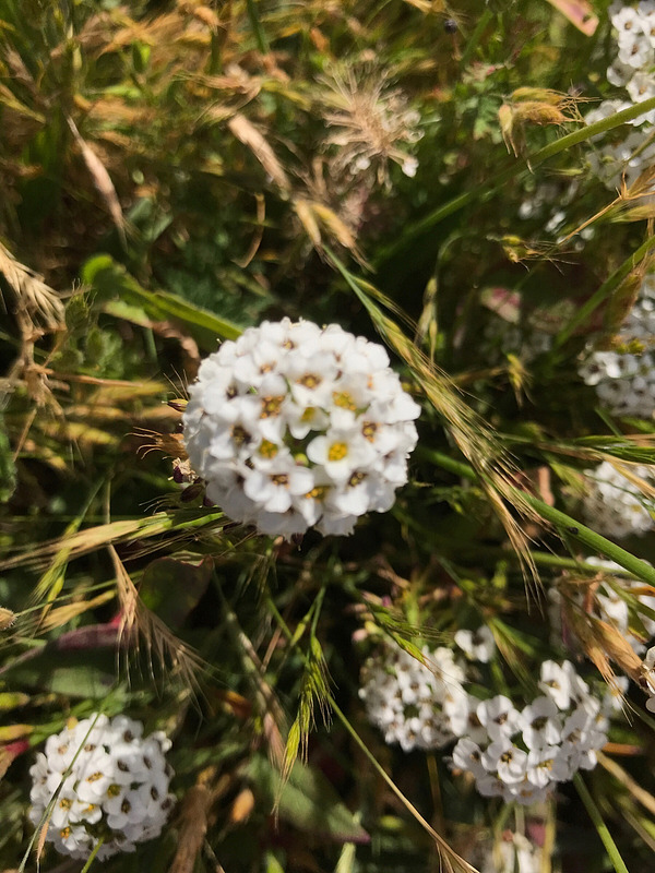 Lobularia maritima (syn. Alyssum maritimum) is a species of low-growing flowering plant in the family Brassicaceae. Its common name is sweet alyssum or sweet alison, also commonly referred to as just alyssum (from the genus Alyssum in which it was formerly classified).