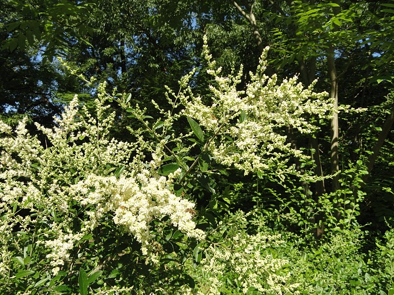 Ligustrum quihoui (waxyleaf privet, 小叶女贞 xiao ye nu zhen) is a shrub native to Korea and China (Anhui, Guizhou, Henan, Hubei, Jiangsu, Jiangxi, Shaanxi, Shandong, Sichuan, Xizang (Tibet), Yunnan, Zhejiang). As with some other members of the genus, L. quihoui is cultivated as an ornamental in many places and has become naturalized and invasive in urban areas and scattered forested locales of the southeastern United States (Texas, Oklahoma, Alabama, Mississippi, Alabama, Florida, North Carolina, Virginia, Maryland).Ligustrum quihoui is a shrubby, semi-evergreen to evergreen privet, one to three meters high. It is noted for its large sparse flowering panicles of scented white flowers, borne late in the growing season, for which it is sometimes grown in gardens.