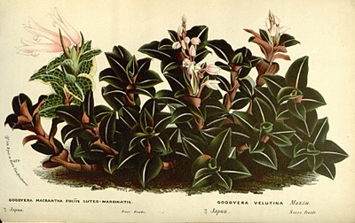 Goodyera, commonly called rattlesnake plantain, jade orchids or ladies' tresses is a wide-ranging genus of orchids in the tribe Cranichideae. About 100 species of Goodyera have been formally described. They are native to Europe, Madeira, Mozambique, North and Central America, islands from the west Indian Ocean to the Pacific Ocean and to Australia. They have a rosette of leaves at their base and usually many small white resupinate flowers. They are similar to orchids in the genus Spiranthes but can be distinguished from them by the shape and colour patterns of the leaves.