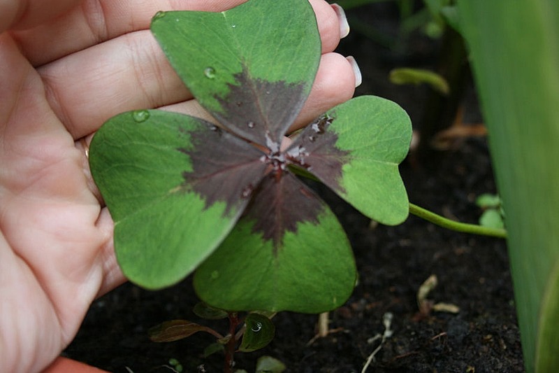 Oxalis tetraphylla (often still traded under its syn. O. deppei) is a bulbous plant from Mexico. A common name is "Iron Cross", after a famous cultivar; it is also known as "lucky clover", and in a wild or feral state as four-leaf sorrel or, least ambiguously, four-leaved pink-sorrel. It has leaves divided into four and has been called "lucky leaf" and even "four-leaf clover", but it is not a true clover. Related to the common wood-sorrel (Oxalis acetosella), it is commonly used as an ornamental plant. It is also edible, the flowers and leaves having a sharp lemon flavor. However, since the oxalic acid in the plant can interfere with the absorption of certain nutrients in the body, especially calcium, too much can be harmful.