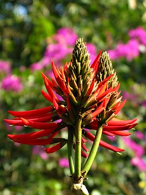 Erythrina is a genus of flowering plants in the pea family, Fabaceae. It contains about 130 species, which are distributed in tropical and subtropical regions worldwide. They are trees, with the larger species growing up to 30 m (98 ft) in height. The generic name is derived from the Greek word ερυθρóς (erythros), meaning "red", referring to the flower color of certain species.