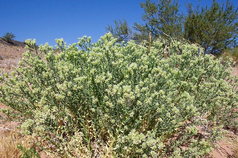 Petalonyx thurberi is a species of flowering plant in the family Loasaceae known by the common names Thurber's sandpaper plant and common sandpaper plant. It is native to the deserts of the southwestern United States and northwestern Mexico, where it grows in sandy and scrubby habitat. It is a rounded or spreading, clumpy subshrub made up of many rough-haired stems approaching one meter in maximum height. The stems are lined with clasping leaves varying in shape from lance-shaped to triangular to oval and sometimes toothed. The inflorescence at the end of the stem is a small, crowded raceme of several flowers. The white flower appears tubular, its petals fused near the spreading tips but open lower, the stamens emerging from outside the corolla.There are two subspecies, with the rarer,…