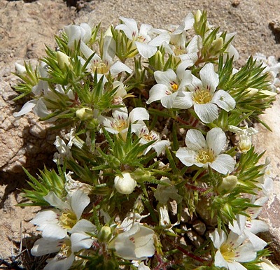 Linanthus is a genus of annual and perennial plants in the phlox family Polemoniaceae. The species are found in western North America and in Chile, with the greatest diversity in California. The stems are erect, with multiple branches arising directly from the base, and grow 2–15 cm tall. The leaves are stem-like (cauline) and opposite, with shapes ranging from entire to palmately lobed, the 3-9 lobes being linear to lanceolate or spatulate. Flowers have a tubular calyx, and the corolla may be funnel- or bell-shaped, or salverform. The genus name is from the Greek for "flax flower", since the flowers superficially resemble those of flax. The genus has recently been split, with many of the species formerly included now transferred to the genus Leptosiphon (Jepson Manual). Selected…