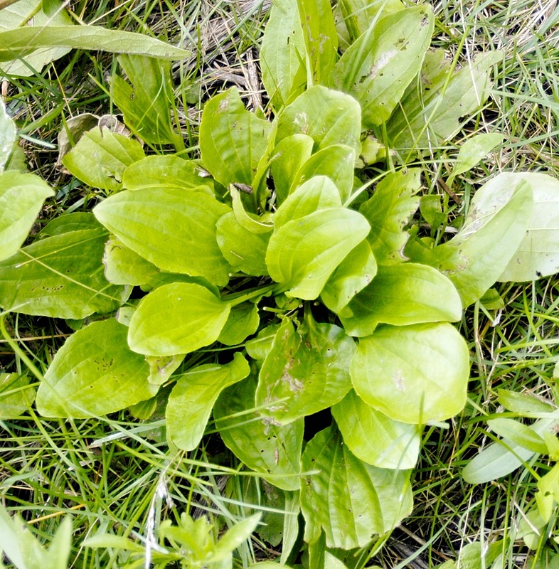 Plantago rugelii is an edible species of flowering plant in the plantain family, Plantaginaceae. It is native to North America, where it occurs in eastern Canada and the central and eastern United States. Its common names include American plantain, blackseed plantain, pale plantain, and Rugel's plantain. The species name rugelii honors Ferdinand Ignatius Xavier Rugel (1806-1879), a German-born botanist and pharmacist.This perennial herb grows from a taproot and fibrous root system. It produces a basal rosette of wide oval leaves with longitudinal veining and a somewhat waxy texture. The base of the petiole may be reddish or purple. A scape bears clusters of whitish flowers. The fruit is a capsule about half a centimeter long containing several seeds. It splits down the middle. Plantago…