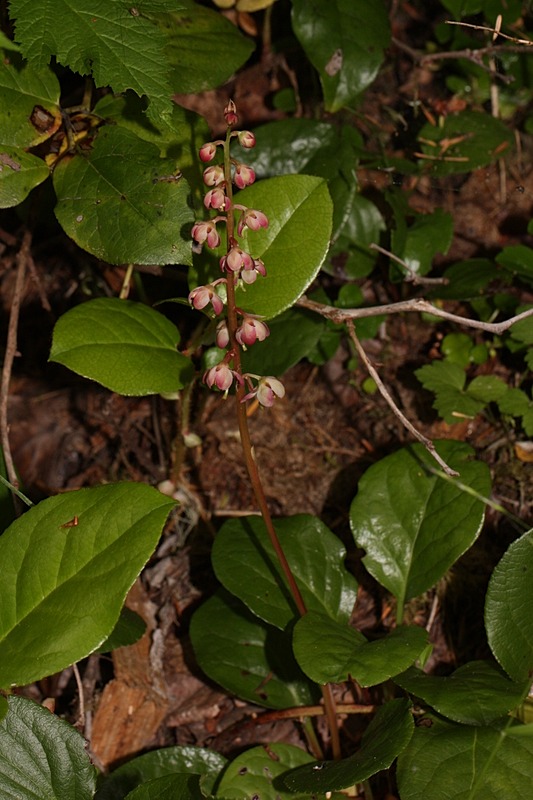 Pyrola asarifolia, commonly known as liverleaf wintergreen, bog wintergreen or pink wintergreen, is a plant species of the genus Pyrola native to western North America. It is found primarily on forest margins at mid latitude in the Pacific Northwest and northern California. It is so named simply because its leaves maintain their green color through winter.