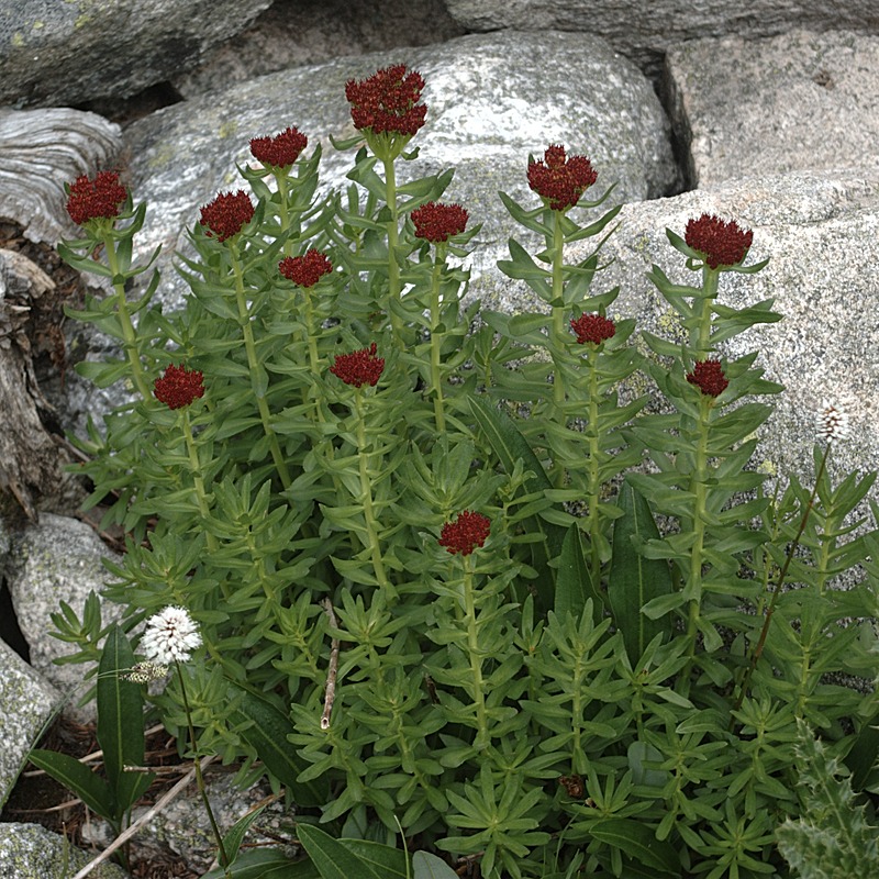 Rhodiola integrifolia is a species of flowering plant in the stonecrop family known by the common names ledge stonecrop, western roseroot, and king's crown. It is native to north-easternmost Russia, including Kamchatka, and western North America, where it grows in mountainous habitat in subalpine and alpine climates, including meadows, cliffs, and talus. It is a perennial herb producing a stout stem from a fleshy, branching caudex, reaching a maximum height near 30 centimeters. The fleshy leaves are alternately arranged on the stem, widely lance-shaped to oval and pointed, flat but upcurved toward the tip, reaching 2.5 centimeters long. They are green when new and age to orange, rose, or red. The inflorescence is a dense cyme of up to 50 flowers with fleshy petals in shades of bright red…