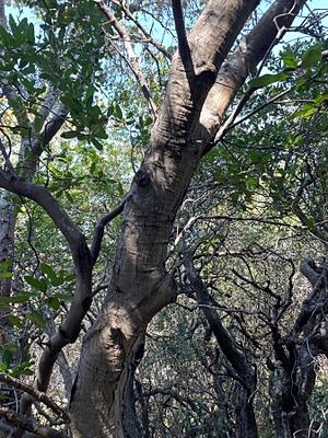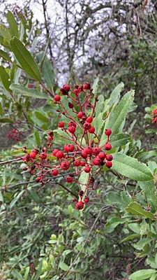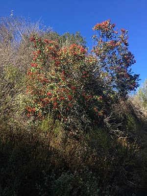 Heteromeles arbutifolia (; more commonly by Californian botanists), commonly known as toyon, is a common perennial shrub native to extreme southwest Oregon, California, Baja California, and British Columbia. It is the sole species in the genus Heteromeles. Toyon is a prominent component of the coastal sage scrub plant community, and is a part of drought-adapted chaparral and mixed oak woodland habitats. It is also known by the common names Christmas berry and California holly.