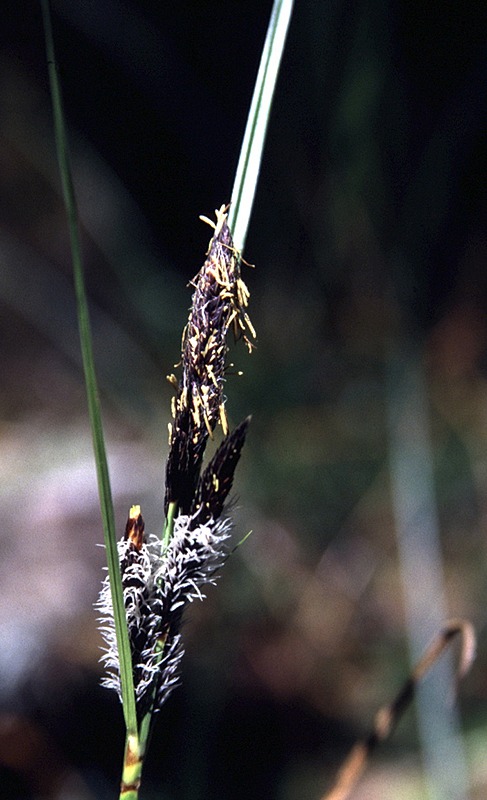Carex obnupta is a species of sedge known by the common name slough sedge. It is native to western North America from British Columbia to California where it grows abundantly in wet, often saline habitat such as wetlands. The plant produces upright, angled stems approaching 1.2 meters in maximum height, growing in beds or colonies from rhizome networks. The inflorescence is a cluster of flower spikes accompanied by a long leaflike bract. The pistillate spikes and sometimes the staminate spikes dangle on peduncles. The fruit is coated by a hard, tough, shiny perigynium which is generally dark in color.