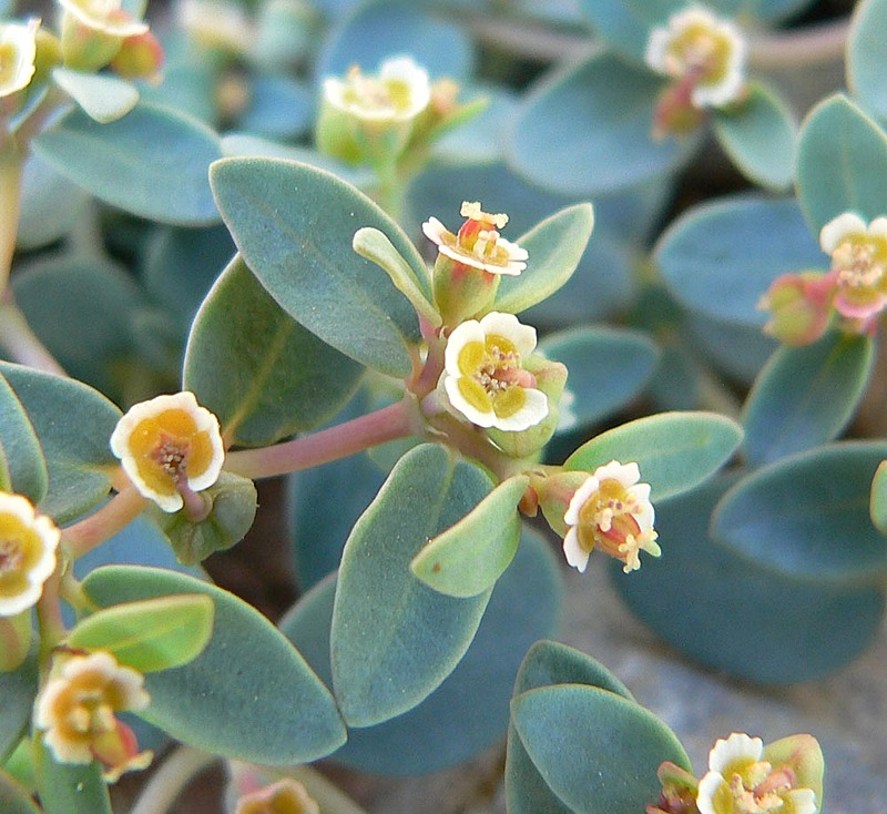 Euphorbia fendleri is a species of Euphorbia known by the common name Fendler's sandmat. It is native to much of the southwestern and central United States and northern Mexico, where it grows in scrub and woodland habitat in desert and plateau regions. This is a mat- or clump-forming reddish-green plant with a crooked, creeping, hairless stem. The leaves are rounded, oval, or spade-shaped, smooth along the edges and generally coming to a point, and not much more than one centimeter in maximum length. The tiny inflorescence is a cyathium with white-edged, scalloped appendages surrounding the actual flowers. There is a ring of 25 to 35 staminate flowers around one pistillate flower. The ovary of the pistillate flower enlarges into a lobed fruit about 2 millimeters long.