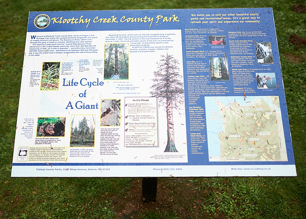 The Klootchy Creek Giant was the largest Sitka Spruce (Picae sitchensis) in the United States, towering more than 200 feet tall and measuring 17 feet, 10 inches in diameter – and attracting more than 100,000 visitors each year. Estimated to be between 500 and 750 years old, it was the oldest tree in Oregon and possibly the oldest living thing in the state.