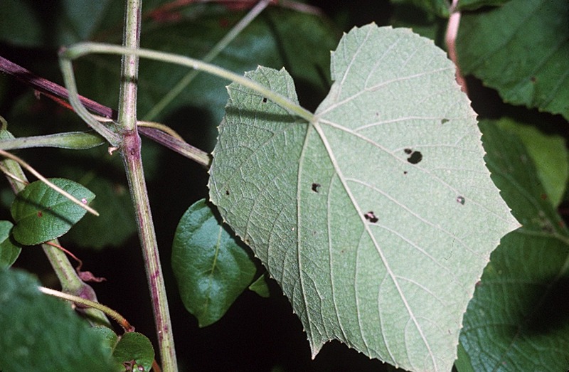 Vitis cinerea, the graybark grape, is a variety of grape. It has small black berries that are mildly unpleasant to eat. Plentiful in Missouri and Louisiana, it is also found throughout the eastern half of the US as far west as Texas, north to Illinois, and south to Florida. It is also known by the name winter grape or possum grape. Vitis cinerea is an American native grape. The leaves are cordiform-emarinate, flabby, dull, limb finely wrinkled (like crepe) between the sub-veins. The teeth of the leaf are very blunt. The buds are grey-ashy-violet.