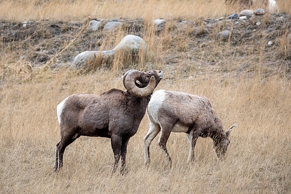 Bighorn sheep ram and ewe in Gardiner, Montana, Aston Hooker (NPS) photograph above.