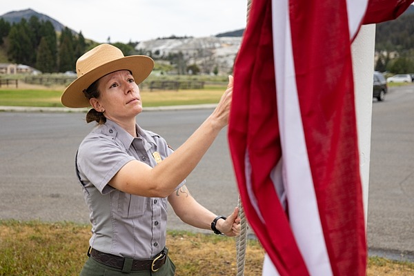 Ranger Vanessa, raises the flag in Mammoth Hot Springs, Jacob W. Frank (NPS) photograph above.