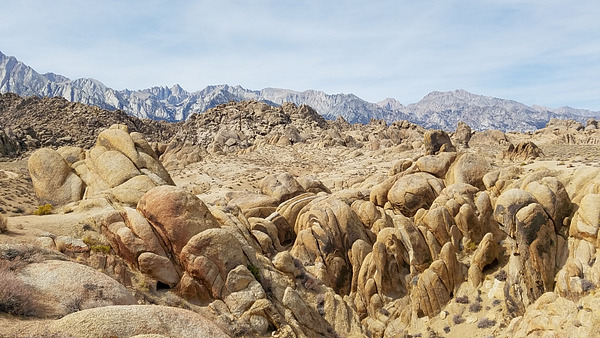 The Alabama Hills are a formation of rounded rocks and eroded hills set between the jagged peaks of the Sierra Nevada and the geologically complex Inyo Mountains. Both geologic features were shaped by the same uplifting occurring 100 million years ago. Visitors enjoy touring film sites, photography, rock climbing, exploring natural arches, and viewing the swaths of wildflowers that bloom every spring. Horseback riding and mountain biking are popular activities.