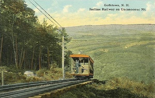 The Uncanoonuc Mountains are two small mountain peaks in Goffstown, New Hampshire, United States. The north peak, the highest point in Goffstown, has an elevation of 1,324 feet (404 m) above sea level, and the south peak rises to 1,321 feet (403 m). The name may be derived from the Massachusett language term kuncannowet (Massachusett for "breast"). The area was developed in the early 1900s as a resort with a hotel and incline railway. The mountains are still a good spot for hiking, snowshoeing, and scenic views of the nearby skyline of Manchester and even, on a clear day, the faint skyline of Boston. They were the site of a small ski operation in the 1930s and 1940s, served by the incline railway that went up the south peak. With three main trails from top to bottom, it was a popular ski…