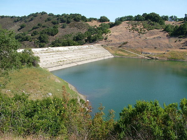 Guadalupe Reservoir is a reservoir in Santa Clara County, California, about 5 miles (8 km) east of the city of San Jose, California. It is at an elevation of 614 feet (187 m). It has a capacity of 3,415 acre feet (4,212,000 m3). The dam is located along Hicks Creek on Guadalupe Creek, a tributary of the Guadalupe River. The Guadalupe River was named by the de Anza expedition on March 30, 1776, Rio de Nuestra Señora de Guadalupe, in honor of the Mexican saint who was the principal patron saint of the expedition. Guadalupe dam and reservoir is one of the six original systems approved for construction by voters in 1934, and was constructed in 1935. The surface area of the reservoir is 74 acres (300,000 m2).
