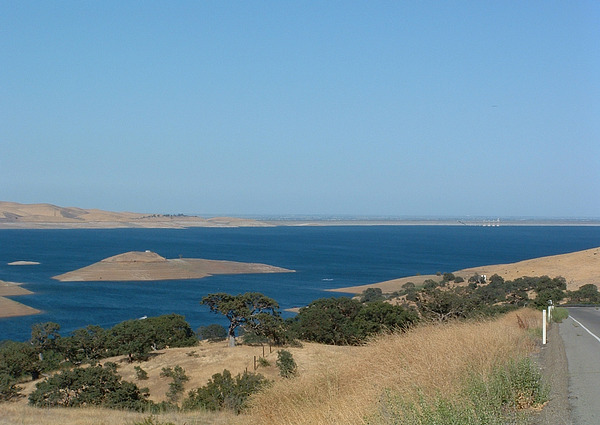 The San Luis Reservoir is an artificial lake on San Luis Creek in the eastern slopes of the Diablo Range of Merced County, California, approximately 12 mi (19 km) west of Los Banos on State Route 152, which crosses Pacheco Pass and runs along its north shore. It is the fifth largest reservoir in California. The reservoir stores water taken from the San Joaquin-Sacramento River Delta. Water is pumped uphill into the reservoir from the O'Neill Forebay which is fed by the California Aqueduct and is released back into the forebay to continue downstream along the aqueduct as needed for farm irrigation and other uses. Depending on water levels, the reservoir is approximately nine miles long from north to south at its longest point, and five miles (8 km) wide. At the eastern end of the reservoir…
